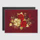 De samenstelling van twee op ambachtelijke wijze geverfde rode rozen en één gouden roos, versierd met goud, juwelen bladeren op een getextureerde achtergrond.