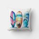 Dit waterverf schilderij beschikt over drie surfplanken met unieke design. De eerste surfplank heeft een zonsondergang geschilderd, de tweede surfplank heeft een palmboom en de derde surfplank heeft een golf. De surfplanken rusten tegen een achtergrond van turquoise water, het creëren van een rustige en zomerse scène.