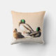 Dit werpen kussen kenmerkt een artistieke teruggave van drie Mallard Ducks die op een bleke oranje gradiëntachtergrond worden doorgeperst. De mannelijke eenden kunnen worden geïdentificeerd aan de hand van hun iriserende groene koppen en gele snavels. De vrouwen hebben mooie veren in tinten bruin en goud met oranje snavels. Het afbeelding wordt op de achterkant herhaald.
