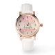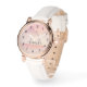 Een horloge met een mooie charmante illustratie. Pastel kleuren van roze en perzik. Landschapscène met bergen en wolken.