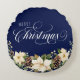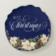 Een rond kussen met aan beide zijden hetzelfde ontwerp op een diepblauwe achtergrond. Een traditioneel kerstontwerp. De tekst kerst in een prachtig script met wervelingen en waterverf ontwerp van witte Poinsettia, bessen en dennenappels. Wordt geleverd in verschillende modellen en maten. Zie de andere bijpassende producten in dit collectie voor een samenhangend thema.