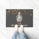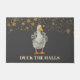 Een feestelijke vakantiedormat met een witte kersteend versierd met een hulstkrans om zijn nek en gouden sneeuwvlokken op de achtergrond. Het exemplaar Duck the Halls kan worden gewijzigd in uw familienaam of een kopie van uw keuze.
