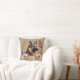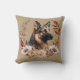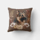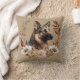 Een prachtig portret van een majestueuze Duitse herdershond wordt in het midden van een herfstkrans geplaatst in tinten van kaneelbruin, bruin en crème. Het ontwerp van de hond en krans wordt op een lichtere bruine achtergrond geplaatst. Beide zijden van het kussen hebben hetzelfde afbeelding, maar de achterzijde heeft een donkerbruine achtergrond.