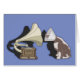 Un chien avec un éraflure-cône hurlant à un tourne-disque antique de phonographe avec un klaxon en laiton d'entonnoir. Couleur, ombres pour l'effet gentil et à trois dimensions, sur des T-shirts, affiches, cartes, cadeaux.
