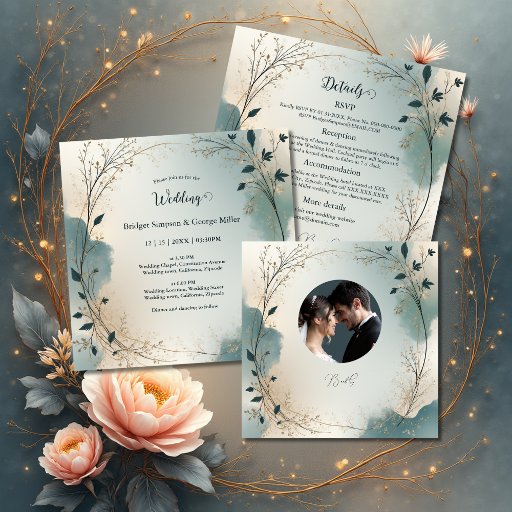 Dusty Blue Beige Boho Chic foliage wreath all in one Wedding invitation. Celebrate your special day with this exquisite Boho chic elegant modern wedding invitation. The design beautifully combines a soft dusty blue beige watercolor palette with a sophisticated botanical nature theme. The aesthetic is both simple minimal and charming, featuring a delicate wreath foliage border and subtle leaves glitter sparkle accents that catch the light. A lovely handwritten script is used for the names, adding a personal and romantic touch. This minimalist botanical leaves wedding invitation is the perfect choice for couples dreaming of an elegant, nature-inspired ceremony. As part of a customizable wedding collection, this AI-generated artwork allows couples to personalize it with their own names, text, and details, making every piece unique.