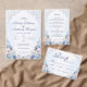 This elegant save the date design pairs soft dusty blue watercolor flowers with a favorite engagement photo for a romantic and timeless wedding announcement. Delicate blush accents and French-inspired scrollwork create a refined look that suits classic, formal, and garden wedding styles beautifully. The photo layout adds a personal touch while the floral frame keeps the overall design polished and graceful. It is a lovely choice for couples who want coordinated blue wedding stationery with a soft, airy feel.