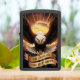 Een illustratie van een adelaar met uitgestrekte vleugels die tot een zonsopgang met een banner lezen Rise Above and Find Your Happy.