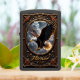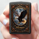 This incredibly majestic image showcases a custom, matte black rectangular case featuring a powerful patriotic graphic. The artwork centers on a magnificent bald eagle with widespread wings, soaring through a dramatic cloudy sky with golden light breaking through. The eagle appears powerful and dynamic, surrounded by scattered golden stars. The entire composition is spectacularly framed by an ornate, dark metallic border adorned with intricate scrollwork, stars, and accents. The words "EAGLE" and "Honor" are prominently displayed in bold, gilded lettering. This design features a highest quality print; the overall look powerfully embodies freedom, strength, and national pride. The name "Alexander" is featured above the eagle, and the lighter case comes in 12 colors.