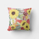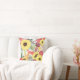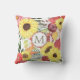 Hier is een werpkussen met een doortastend bloempatroon in kleuren van roze, violet, zacht groen, bruin en helder geel. Grote heldere zonnebloemen zijn de belangrijkste aantrekkingskracht. Het kleurrijke patroon wordt op een witte achtergrond geplaatst. De achterkant van de kussen heeft hetzelfde patroon, maar met een witte cirkelbanner die in vierkant roze en grijs groen is gehuld. Je monogram staat in het midden.