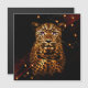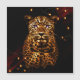 Eclipse Majesty, laat een luipaard zien met gloeiende gouden vacht en onderscheidende vlekken, geplaatst tegen een donkere achtergrond. De luipaardogen worden verlicht in fel paarse kleuren, waardoor een opvallend en mystiek effect ontstaat. De donkere omgeving wordt geaccentueerd door verspreide, warme lichten, waardoor de scène een dramatische bijna buitenaardse sfeer krijgt.