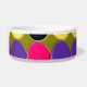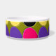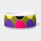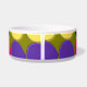 Ce magnifique bol d'animal de compagnie est recouvert de nombreuses taches de violet, de jaune rose et de noir disposées en rangs séparés par des zones de vert foncé. Cette abstraite fantastique évoque un mur recouvert de carreaux de peinture après un match de paintball.