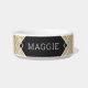 Parties scintillant dorée et bol à chien personnalisé noir avec un design art déco boho mashup avec un motif chevron abstrait moderne et géométrique superposé avec le nom de votre chat ou animal de compagnie imprimé directement sur le bol élégant.