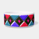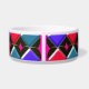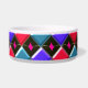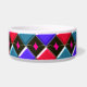 Ce magnifique bol d'animal de compagnie a un motif abstrait avec des rangées de diamants rouges, bleu clair et bleu foncé dessus. Chaque rangée est séparée par une rangée de diamants noirs. Chacun des diamants noirs a un trou au milieu. Le haut à gauche de chaque diamant ressemble à une lueur. Voici l'amusement, vous pouvez remplir ce trou avec un choix de plus de 200 couleurs pour faire un design unique. Ici, les trous ont été remplis d'une couleur rose vif perceuse comme exemple. Pour sélectionner votre couleur et voir l'effet qu'elle a sur la conception, cliquez simplement sur le bouton "customiser", allez à la section des couleurs et cliquez sur arrière - plan puis sélectionnez la couleur que vous souhaitez mettre dans la conception. Vous pouvez essayer autant de couleurs que vous le souhaitez jusqu'à ce que vous trouviez celui qui fonctionne pour vous.