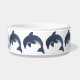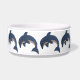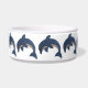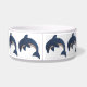 Ce bol de nourriture pour animaux de compagnie est entouré d'un joli éclat comme des dauphins bleu foncé avec des ventres blancs dans des positions de saut qui ont des yeux tourbillonnants noirs et blancs.