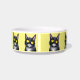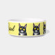 Chatte chatte noire mignonne aux grands yeux jaunes, bol d'alimentation personnalisée pour chat.