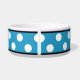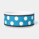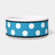 La cuvette en céramique élégante de chien a conçu avec un grand motif de point blanc de polka au-dessus de bleu et personnalisé avec votre nom d'animal familier.