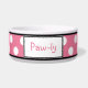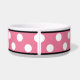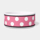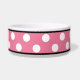 La cuvette en céramique élégante de chien a conçu avec un grand motif de point blanc de polka au-dessus de rose et personnalisé avec votre nom d'animal familier.