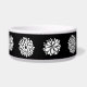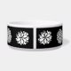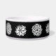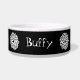 Plat élégant de chien fait dans en céramique blanc avec une rayure noire audacieuse autour du milieu. Les graphiques des fleurs stylisées blanches de chrysanthème décorent la bande bleue. Le texte fait sur commande blanc, au milieu, est prêt à personnaliser pour votre cabot. La grande idée de cadeau pour n'importe qui avec un animal familier, vient dans deux tailles.