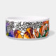 An original watercolor and ink artwork is transferred to a cheery Pet Bowl with a botanical theme