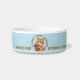 Caught red-handed! This high-quality ceramic pet bowl features a whimsical ginger kitten with a basket of stolen flowers on a trendy dusty azure background. The artwork is created using AI with manual digital refinement. All text is editable: change the 'Flower Thief' title and add your pet's name to make it unique.