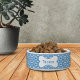 Gâtez votre animal de compagnie précieux avec ce bol pour animal de compagnie en gingham bleu intemporel personnalisé avec un motif de pattes ! Personnalisez-le avec le nom de votre chien dans l'os.
