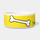 Bol d'eau/nourriture pour chien en céramique blanche, jaune, autour de l'extérieur. Des images d'os de dessins animés, courent autour de l'extérieur du bol. Le texte personnalisé noir, à l'avant, est prêt à personnaliser, pour votre animal de compagnie ou comme une idée de cadeau pour tout propriétaire d'animal de compagnie. Des produits assortis pour animaux de compagnie sont disponibles.