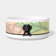 joli labrador noir qui regarde un bol de nourriture ou d'eau.