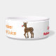 Reindeer Carrot Juice est écrit en orange. Personnaliser l'amour, Nom de famille. Les Sucres de canne bleus roses et blancs rouges sont sur les côtés du bol. Mignonne personnage de dessin animé Super Snow the Blue-eyed Reindeer. Souvenirs festifs de Noël. Oeuvre originale © 2016 TamiraZDesigns.