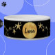 Black & Gold Moon Luna and Stars Personnalisé Pet Feeding and Water Bowl présente une pleine lune/luna avec des étoiles d'or sur un arrière - plan noir qui imite le ciel nocturne. Personnalisez-le avec le nom de votre animal de compagnie - il fonctionne pour un chien, un chat ou un autre animal de compagnie - et changez ou ajoutez facilement vos propres images, texte ou arrière - plan pour créer une création unique pour votre animal de compagnie ou laissez-le tel que conçu pour un animal de compagnie cool. Voir d'autres bols pour animaux de compagnie personnalisés ainsi que la décoration personnalisée pour la maison, le bureau ou à l'extérieur à l'adresse zazzle.com/DIYDecor.