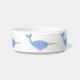 Ce superbe bol pour animaux de compagnie présente une image d'art numérique d'un mignon bébé garçon narval magique bleu. Le corps principal du narval a une texture rugueuse et est bleu tandis que le ventre est d'une couleur bleu gris. Le narval a un œil noir avec une pupille blanche et une corne dorée brillante sur son visage. Il a également une queue et des nageoires délicates.