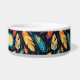 Bol pour animaux de compagnie lumineux et coloré de style sud-ouest amérindien avec des plumes de couleur turquoise, orange, jaune et rouille sur fond noir. Au centre, une bannière de couleur pêche où vous pouvez personnaliser avec le nom de votre chien.