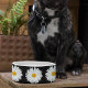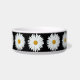 Bol de nourriture pour animaux de compagnie en céramique pour votre chat ou chien qui présente l'image d'une fleur de marguerite blanche avec centre jaune contre un arrière - plan noir et imprimé dans un motif extensible. Un joli design floral ! Sélectionnez la taille de votre bol d'animal de compagnie.