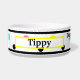 Personnalisez le nom de l'animal en noir à l'intérieur d'une zone encadrée en rectangle jaune. Une citation humoristique « N'oubliez pas de remplir mon eau » est écrite sur le côté opposé du nom. Des pois géométriques colorés avec une bordure noire et des points roses, jaunes, turquoise et noirs sur fond blanc. Œuvre originale et conception de citation © TamiraZDesigns.