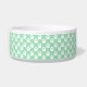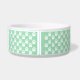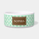 Ce bol pour animal de compagnie présente un motif d'empreintes de pattes de chien blanches sur fond vert menthe. Il y a également une bannière marron avec une zone de texte personnalisable pour le nom de votre animal. La couleur beige peut être changée en n'importe quelle autre couleur sous personnalisation.
