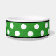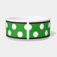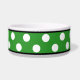 Élégant bol de chien en céramique conçu avec un grand motif de pois blanc sur le vert et personnalisé avec le nom de votre animal de compagnie.