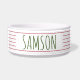Le bol à chien rayé rouge et vert personnalisé aux couleurs de Noël a une esthétique de ferme moderne avec plusieurs lignes fines et le nom du chien imprimé à l'extérieur. Avec l'éditeur de modèle avancé, vous pouvez changer la police, les couleurs arrière - plans ou rayées pour correspondre à votre décor ou à votre saison.