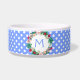 Bol en céramique blanche pour nourriture/eau pour chien fait dans royal bleu avec des points blancs. Une jolie couronne florale ronde a un monogramme à une lettre bleu prêt à personnaliser, pour votre animal de compagnie ou comme une excellente idée de cadeau pour tout propriétaire d'animal.