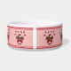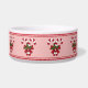 L'illustration originale de Destei de deux gâteries à rayures rouges et blanches décorées d'un arc rouge et d'un saint de Noël / plante saint commun. Le design est placé quelques fois autour du bol. Il y a aussi une zone de texte personnalisable pour un nom ou un autre texte personnalisé. Le design est encadré par une bordure rouge en haut et en bas et la couleur arrière - plan est rose. Ce design festif aux couleurs de Noël rouge et vert classique est idéal pour la période des Fêtes lors de la décoration avec la palette de couleurs traditionnelle. Le design convient aussi bien aux animaux de compagnie appelés "Sucre de canne" ou "menthe poivrée", par exemple.