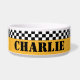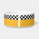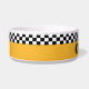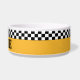 Ajoutez du style vintage NYC à l'heure du dîner de votre animal. La couleur jaune vif du taxi traditionnel et les rayures de damier sont des modèles classiques de cabine de contrôle. Remplir le look nostalgique vintage est le nom de votre animal dans les lettres au pochoir. Beep Beep - c'est le souper !