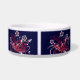 Ce dessin est un tatouage de nombreuses fleurs, feuilles et vignes différentes. Quelques papillons volent autour des fleurs. Les couleurs du tatouage sont de couleur rouge avec un soupçon de pêche. Il y a 4 motifs sur le plat qui contournent les côtés du plat. Ce plat pour chien peut être customisé avec votre nom d'animal de compagnie sur le devant du plat.