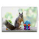 Un écureuil pose entre deux cadeaux aux couleurs vives sur cette photo originale.