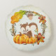 Een ronde kussen met een schattige eekhoorn die achter een oranje waterverf pompoen staat. Een blad dat hen omringt met een eikenblad en oranje bloemen en andere sprigs en bladeren. Achtergrond achter het afbeelding is een faux perkament afbeelding in een crèmekleur, met een ruw gerijpt uiterlijk rond de randen.