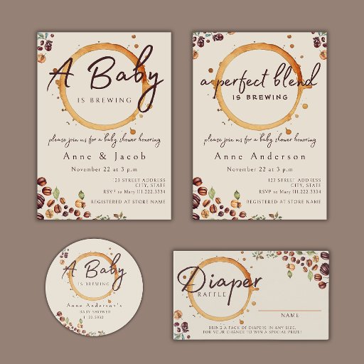 Nodig vrienden en familie uit om de perfecte mix van liefde en plezier te vieren met leuke koffie thema baby shower uitnodiging! Met een stijlvol waterverf-ontwerp van koffiebonen en een warm, uitnodigend script, is deze genderneutrale uitnodiging ideaal voor een baby shower met koffiesfeer. Het is een unieke en gedenkwaardige manier om de opwindende komst aan te kondigen, of het nu gaat om een traditioneel baby shower of een koppelfeest. De zachte, rustieke look in combinatie met het thema "baby is brewing" maakt het een opvallende keuze voor koffieminnende aanstaande ouders. Breng geliefden samen voor de grote dag met deze charmante uitnodiging - bestel vandaag nog de jouwe!