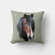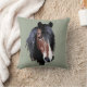 Een kussen of kussen met het hoofd van een paard op een aanpasbare achtergrondkleur van een bleke sage groen. Het paard heeft een dikke zwarte mane en een witte blaze.