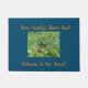 Een 18 x24-inch donkere, Blauwgroen kleurendemat van 18 inch, met een Afbeelding, van een prachtige monboogvlinder, die in het gras legt, met een middelgroot Sinaasappel, kleur. Tekst, die u het met "Uw Familienaam hier!", (bij de bovenkant) laat personaliseren, en ook zegt "Welkom in Ons Huis!" (onderaan), van het.
