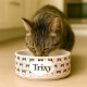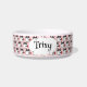 Personaliseer deze moppige kattenkom met de naam van uw huisdier. Roze met een witte naamplaat en bewerkbare naam. Moppe illustraties van cartoonkatten.
