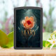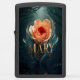In een mystiek bos, bloeit een perzik roos met een rood centrum met de naam Mary in gouden schrift, wat magie toevoegt aan de scène.