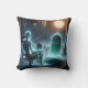 Een spookachtige mannelijke figuur zit in een schommelstoel, tegenover een grafsteen gemarkeerd "R.I.P." onder een volle maan