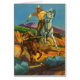 Een kleurrijke illustratie van een cowboy op een paard dat een os beweegt. Van de omslag van een stripboek