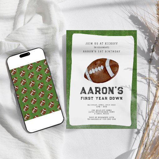 Eerste jaar Down Football Verjaardagsfeestje Dank je kaart Kick off uw kleine rookie's eerste verjaardag in stijl met deze First Year Down 1st Verjaardagsfeestuitnodiging! Vier zijn opvallende status als de 'Rookie van het Jaar' met deze sportieve, football-thema-uitnodiging. Het is versierd met levendige groene en bruine tinten die doen denken aan het footballs veld en vormt het podium voor een levendige viering. Ga met ons mee aan de kick-off voor een sport thema extravaganza die veel plezier, touchdowns en herinneringen belooft. Deze uitnodiging op maat legt de essentie vast van een Amerikaans football spel, ideaal voor de speciale dag van je zoontje. Maak je klaar om groot te scoren en maak van dit eerste verjaardagsfeestje een winnend touchdown-moment!